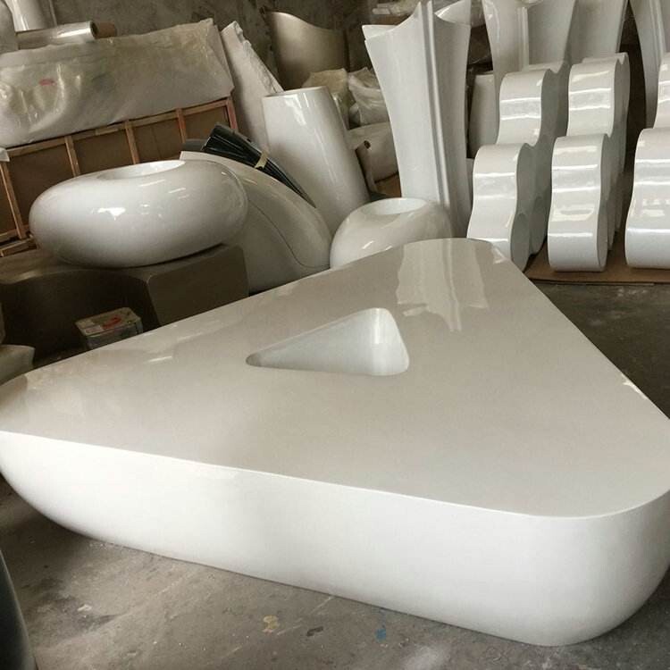 玻璃鋼制作工藝:成品制作前,先將所要制作的產(chǎn)品用特定泥塑材料造出相應(yīng)要制作的產(chǎn)品,在泥塑稿制作完成后,翻制石膏外模,然后將玻璃鋼(即樹脂和玻璃絲布的結(jié)合物)涂刷在外模內(nèi)部。等其干透后打開外模,經(jīng)過合模的程序,獲得玻璃鋼雕塑成品。